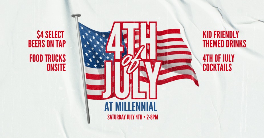 🎆 4th of July Party at Millennial 🎆 Red, White, Brew & BBQ! Celebrate Independence Day the Millennial way! Join us for patriotic fun, cold drinks, and delicious eats all day long. Sip on themed cocktails, grab $4 beer specials, and enjoy American and BBQ food trucks serving up all your favorites. Bring the whole family for kid-friendly activities, music, and a festive atmosphere that’s perfect for fireworks-free fun—or just a day of great food, drinks, and friends. What to expect: 🍹 Themed cocktails for the occasion 🍺 $4 beer specials on select house drafts 🍔 American & BBQ food trucks 🎶 Music, games, and kid-friendly fun 📍 Millennial Brewing Company 📅 Friday, July 4 ⏰ 12–9pm 🎟️ Free entry | Free parking 👨👩👧 Family-friendly | 🐾 Pet-friendly Come hungry, stay festive, and celebrate the 4th in style!